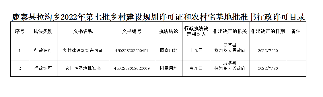 鹿寨县拉沟乡2022年第七批乡村建设规划许可证和农村宅基地批准书行政许可目录