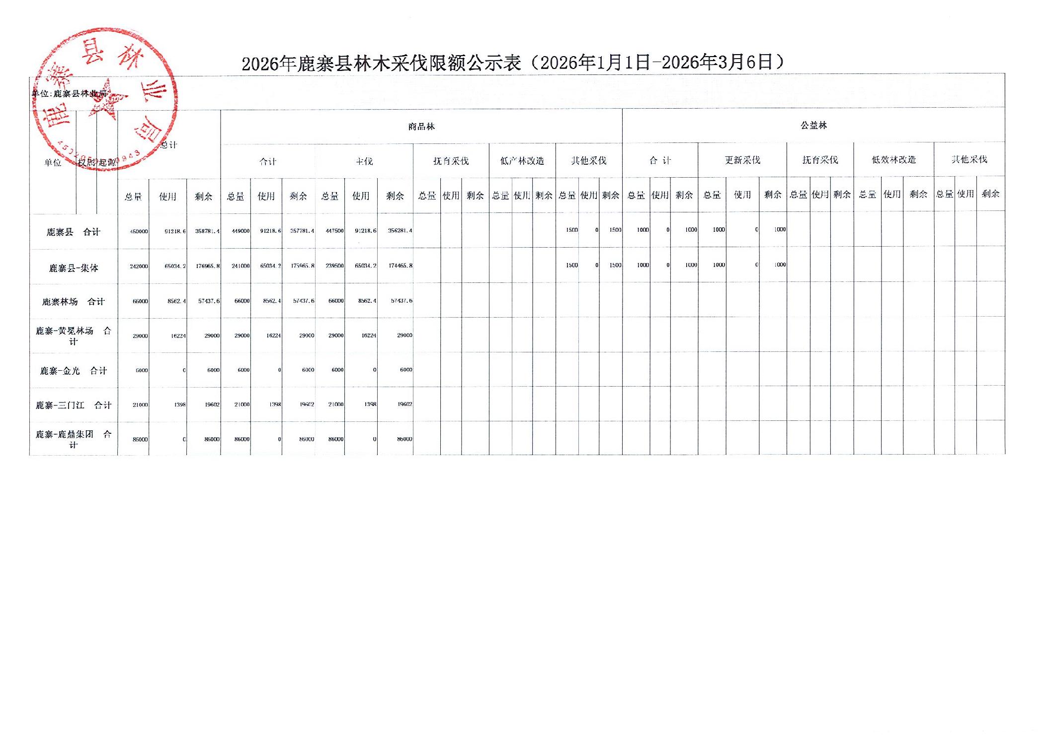 【鹿寨县林业局】2026年鹿寨县林木采伐限额使用公示表(2026年1月1日至2026年3月6日)