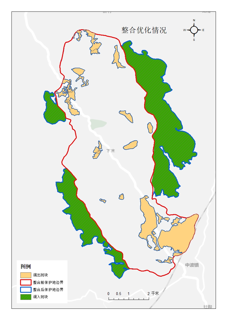 遵照国家有关自然保护地整合优化相关文件,整合优化过程 中,拟调出总面积1176.26公顷,其中城镇建成区面积13.16公顷,村庄建设面积39.69公顷,永久基本农田266.21公顷,人工集体商品林423.18公顷,一般耕地310.88公顷。拟从周边荒漠化和水土流失严重区域调入1208.24公顷公益林面积。