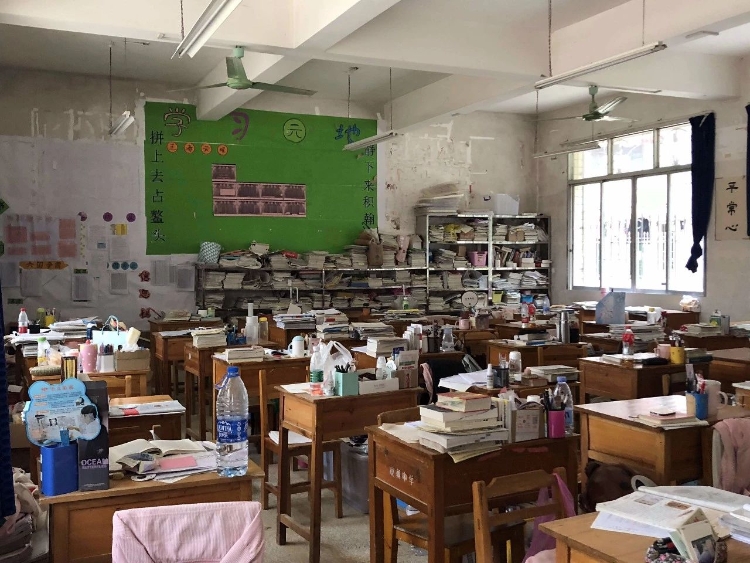 教室里课桌上满满的课本习题