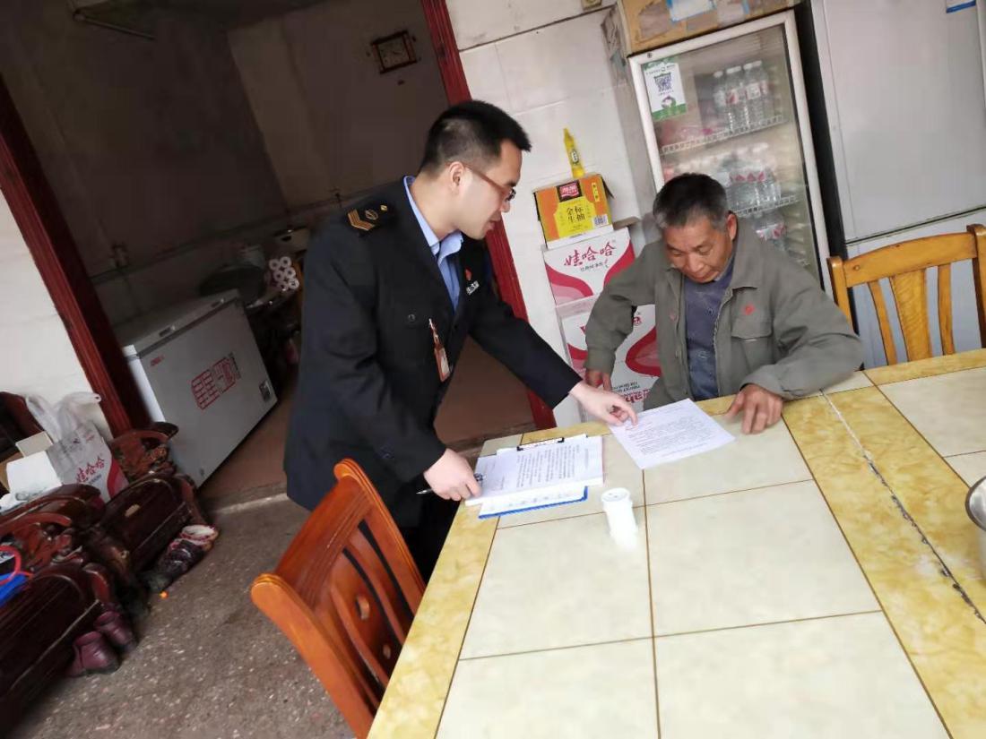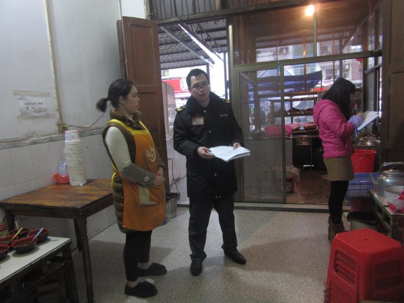 (图为执法人员结合日常监管工作向餐饮店业主宣传扫黑除恶工作)