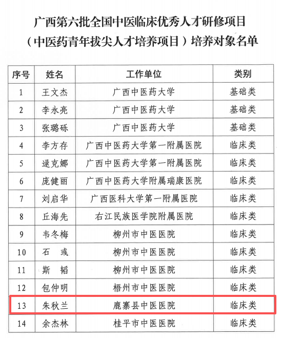近日,国家中医药管理局公布了第六批全国中医临床优秀人才研修项目培养对象名单。全区共有14名医师入选,鹿寨县中医医院消化内科朱秋兰医师凭借扎实的专业能力,成功入选临床类培养对象,成为本批次全区县域医疗机构中唯一获此殊荣的医师。