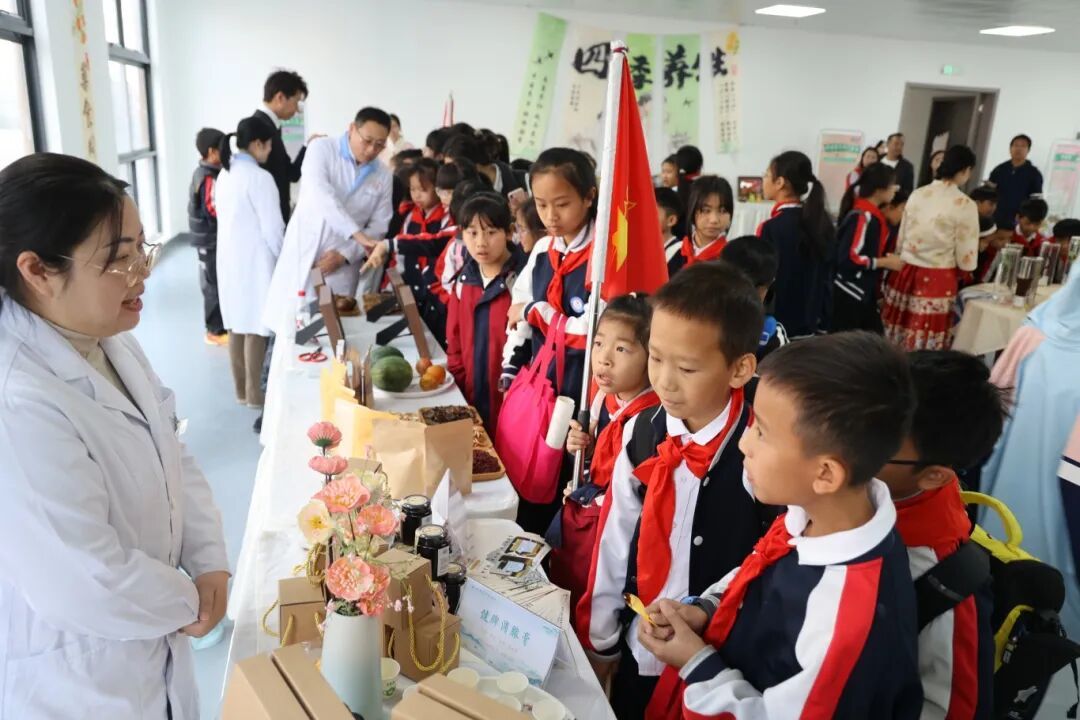 在中医功法带教区,八段锦传承人现场教学,孩子们在动静结合中领悟“治未病”的养生智慧;专业医护团队通过情景模拟教学心肺复苏、海姆立克急救法等急救技能,提升孩子们的应急处理能力;中药贴画展示区陈列着用枸杞、菊花等药材创作的主题贴画;中药特色产品展台则陈列着院内特色制剂、养生茶饮等创新产品。这种“可看、可触、可感”的沉浸式学习模式,让孩子们在互动中感悟中医药文化的博大精深。