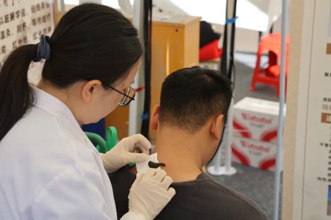 在药王谷集市的“健康义诊区”,由院内专家领衔的义诊团队,为群众提供免费中医体质辨识、健康咨询及个性化调养方案。在理疗体验区,水蛭疗法、藏膏泥灸疗法、中药推拿、耳穴贴豆等中医外治疗法备受欢迎。