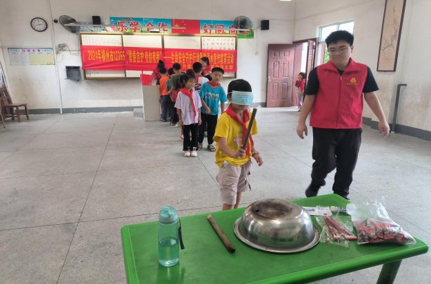 儿童玩“盲人击鼓”游戏