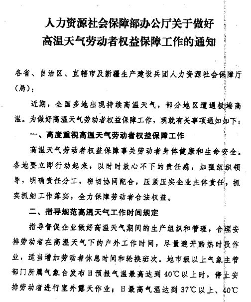 人社厅函〔2023〕91号:人力资源社会保障部办公厅关于做好高温天气劳动者权益保障工作的通知