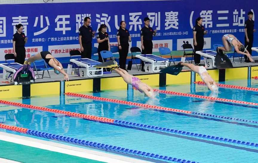 8月23日,2025年全国青少年蹼泳U系列赛(第三站)在鹿寨县鹿寨体育公园开赛,来自全国各地的114名青少年蹼泳选手齐聚一堂,以水为舞台,展开激烈角逐,展现青春风采与竞技实力。