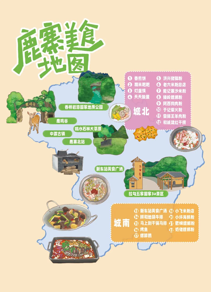 考虑到外地选手较多,为了让家长和小朋友们在比赛之余也能尽享本地美食盛宴、探索鹿寨风光,我们准备了附近的美食地图。地图上标注了多家特色餐厅和小吃店及景点,欢迎大家一起探索鹿寨。