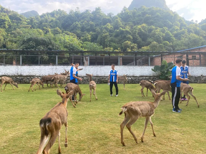 田园间的鹿寨,藏着最治愈的“慢时光”。在鹿鸣谷公园,球员们手持饲料伸向灵动的鹿群,小鹿蹭过指尖的软萌触感,让行程满是童趣;移步中渡大草原,辽阔绿意间散落着悠闲的牛羊,大家学着放牧的姿态漫步草地,把赛场的紧张感化作田园的悠然惬意。