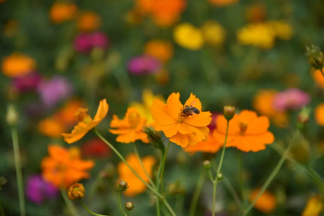 10月13日,记者来到“中渡弄里花谷”,只见连绵起伏的坡地上,明艳的橙黄、热烈的绯红、娇嫩的粉紫等各色花朵层层叠叠、随风摇曳,形成了一片壮观的菊科花卉海洋。步入花丛中,蜜蜂的嗡嗡声与游客的欢笑声交织,忙碌的采蜜身影与蝴蝶的优雅舞姿相映成趣,平添了无数野趣与生机。花田间,精心设置的观光步道、景观平台和打卡装置,为游客提供了绝佳的观赏和拍照角度。