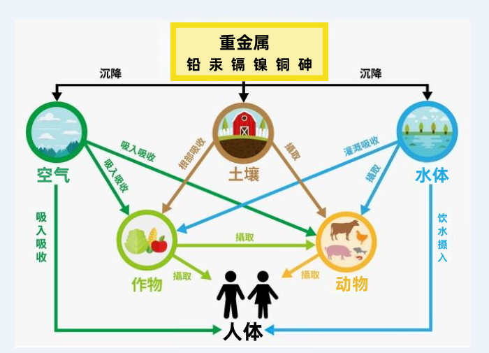 重金属通过食物链进入人体后,会在体内累积并引起各种疾病,如贫血、神经机能失调、肾损伤、癌症等。特别是儿童、老人和免疫力低下人群更容易受到重金属污染的危害。
