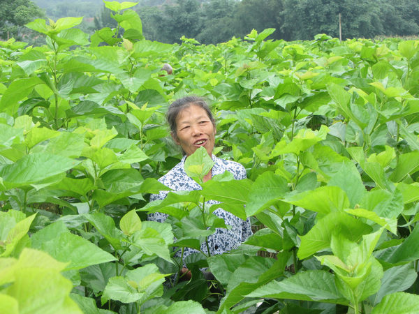 图为九敢村仁里屯村民温小妹正在摘桑叶,谈及土地整治项目,她笑得合不拢嘴。