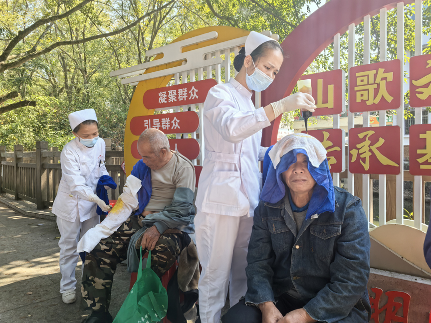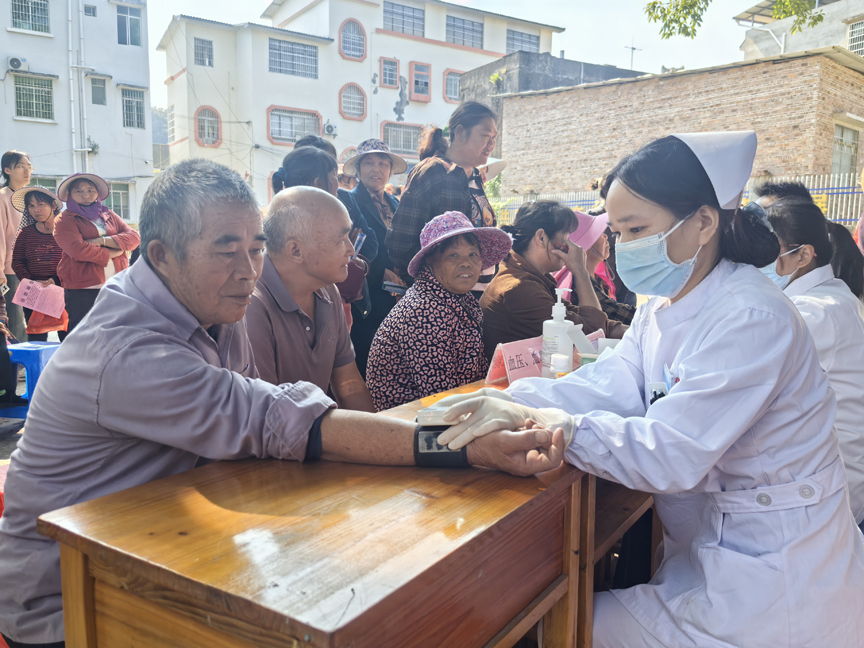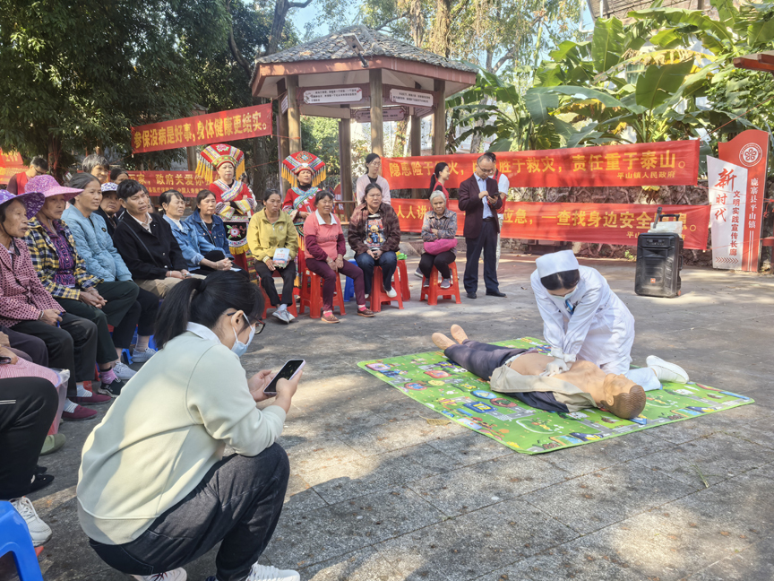 平山镇卫生院的健康宣传区域同样人头攒动,医护人员先为群众讲解健康急救知识,演示心肺复苏技巧,随后开展义诊活动为群众免费测量血压、血糖,进行常见疾病初步筛查,并根据检查结果提供专业的健康建议和指导。