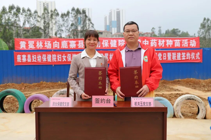 支部联建,深化长效合作。在现场,鹿寨县妇幼保健院妇女保健党支部与黄冕林场机关五党支部正式签订支部联建协议,搭建长期交流合作平台。双方将以党建为引领,在中医药科普、药用植物种植、健康服务、志愿服务等方面深化协作,实现资源共享、优势互补、共同发展。