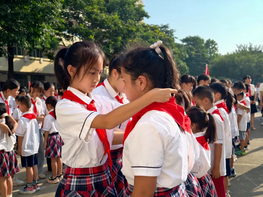 在新队员入队仪式上,老队员为新队员佩戴上鲜艳的红领巾,新队员们在队旗下举起右拳庄严宣誓,以铿锵誓言宣告正式加入中国少年先锋队。