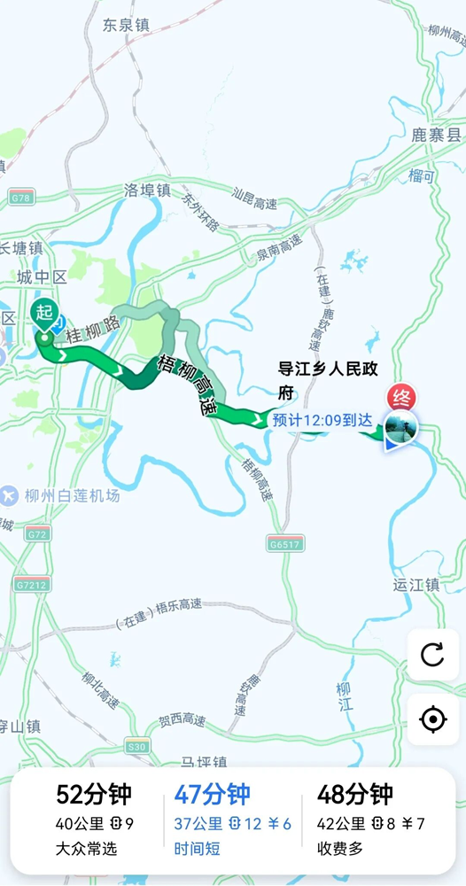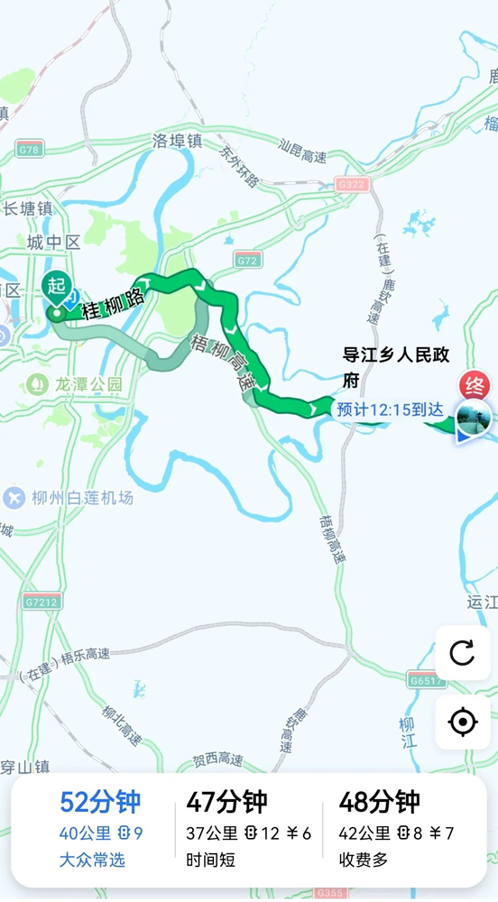 路线二:西江路-静兰大桥-东晋大道-柳州东收费站上高速-G72泉南高速-G6517梧柳高速-江口收费站下-导柳二级公路至导江乡