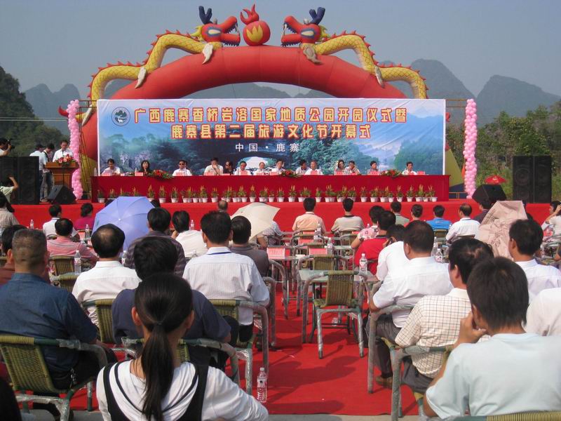 香桥岩溶国家地质公园开园仪式暨第二届旅游文化节开幕式由县委副书记覃建波主持。国家国土资源部地质环境司司长姜建军、国土资源部环境司环境处处长袁小虹、自治区国土资源厅副厅长唐解凤、柳州市人大常委会副主任梁爱凤、柳州市政协副主席张乔林和鹿寨籍知名乡亲(自治区政协副主席章崇任、自治区水利厅厅长钟想廷、广西医科大学原校长马朝贵、自治区卫生厅党组成员、纪检组长于开林、自治区文化节厅原厅长韦壮凡、自治区总工会原主席周民霖)以及曾在我县任职过的河池市委常委、常务副市长陈刚、柳州市柳南区副区长吴自力等特邀嘉宾和我县四家班子领导、县直机关各科局领导出席了当天的开园仪式暨第二届旅游文化节开幕式。