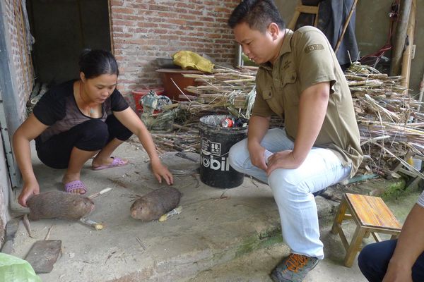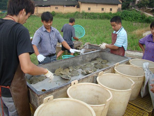 【现场同期声】养猪是鹿寨县的优势产业,然而鹿寨县六老山土猪循环生态养殖示范基地老板刘春强却独辟蹊径,将土猪放在山上散养,成为当地搞养殖业的“另类”,令人关注。 “现在人们平常吃的猪肉,大多是工业饲料喂养大的猪,对于采用原生态饲料养殖的土猪情有独钟,由此激发我干起了养殖土猪的营生。”刘春强说,这种生态散养的土猪,体型适中,胆固醇含量低,肉质鲜美、口感好,很受酒店或一些单位的青睐。 我县以市场为导向,加强宣传发动,强化技术指导和培训,着力发展土猪养殖,积极探索循环生态养殖新模式,并以“猪—沼—菜、猪—沼—果、猪—沼—渔”等循环生态模式发展土猪生产,打造土猪绿色品牌。 今年重点建设鹿寨镇大良村六老山土循环生态养殖示范基地。 【数字说话】目前,该基地已投资350万元,建设猪舍5栋,面积4669平方米,种有玉米、木薯、红薯、稻谷、青菜近20公顷,养殖母土猪155头 、大小肉猪450多头,全部用玉米、木薯、红薯及米糠等原生态饲料喂养,使其养殖的猪保持土猪肉质品位,成为真正的“绿色食品”。该基地计划今年出栏肉土猪1000头,2013年出栏土猪3000头,2014年出栏土猪5000头。 目前,县水产畜牧兽医局正在引导业主成立六老山土猪养殖公司,帮助开展产地认定和产品认证工作,注册“六老山牌”土猪商标,打造六老山土猪品牌。通过示范样板辐射,加快循环生态土猪养殖的发展。拉沟乡群众打捞黄沙鳖准备拿到市场去出售。