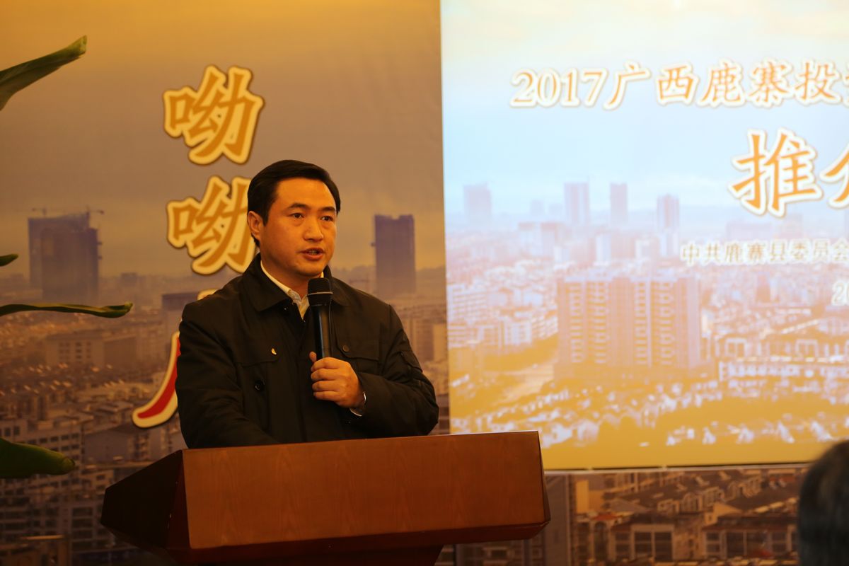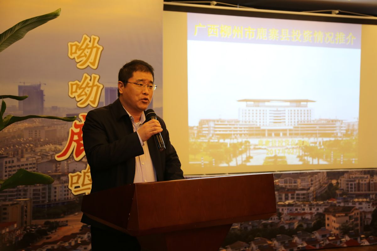 刘胜友向来宾发出邀请。他说,广西鹿寨县地处广西中部,因 “仙人牧鹿”的传说而得名,历史悠久,交通便利,人杰地灵,素有“桂中宝地”之称。地处广西工业城市柳州市和国际旅游城市桂林市之间,是广西主体功能区重点开发区之一,是粤桂黔高铁经济带合作试验区(柳州)广西园的重要组团,是珠江—西江经济带的重要节点,也是柳州市都市经济圈的重要部分,和柳州汽车城无缝连接。鹿寨县同时又是一个山水自然风光非常秀美的地方,拥有国家AAAA级景区、“中国最美地质公园”的鹿寨香桥岩溶国家地质公园、中国首批“中国特色小镇”、“国家历史文化名镇”的中渡古镇、广西鸟类自然保护区拉沟原始森林等众多的风景,一年四季气候宜人,非常适合体验式休闲旅游、人文旅游。近年来,鹿寨县充分发挥作为“桂中宝地”在区位、资源、交通、人文、服务等方面的优势,主动融入国家“一带一路”、珠江—西江经济带、粤桂黔高铁经济带合作试验区建设,积极推进与柳州市区产城融合,形成了错位发展、互补发展的局面,经济社会呈现良好发展态势,焕发着无穷的活力,也为广大企业家在鹿寨投资兴业带来了无限商机。中国神华集团、碧桂园、东莞明仕汽配等一批行业头或高新技术企业先后到鹿寨投资、发展,产生了良好的经济效益和社会效益。热忱欢迎更多的客商朋友来鹿寨观光旅游、投资兴业,与鹿寨人民共享人生出彩的机会、共创更加美好的未来,衷心期盼各位乡友常回家走一走、看一看。鹿寨县将以最大的诚意、尽最大的努力,创造最优的环境,提供最优的服务,为项目建设保驾护航,促使项目尽快落地生根、开花结果。