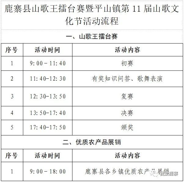 整个活动以山歌王擂台赛、优质农产品展销为主体,过程穿插有奖知识问答、歌舞表演、歌王即兴演唱山歌等内容,精彩活动不容错过。