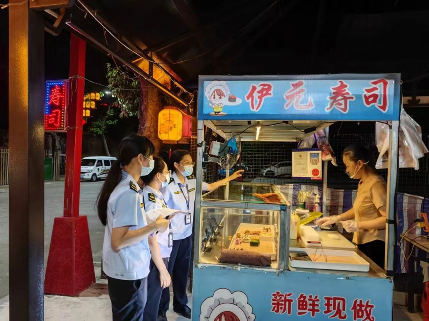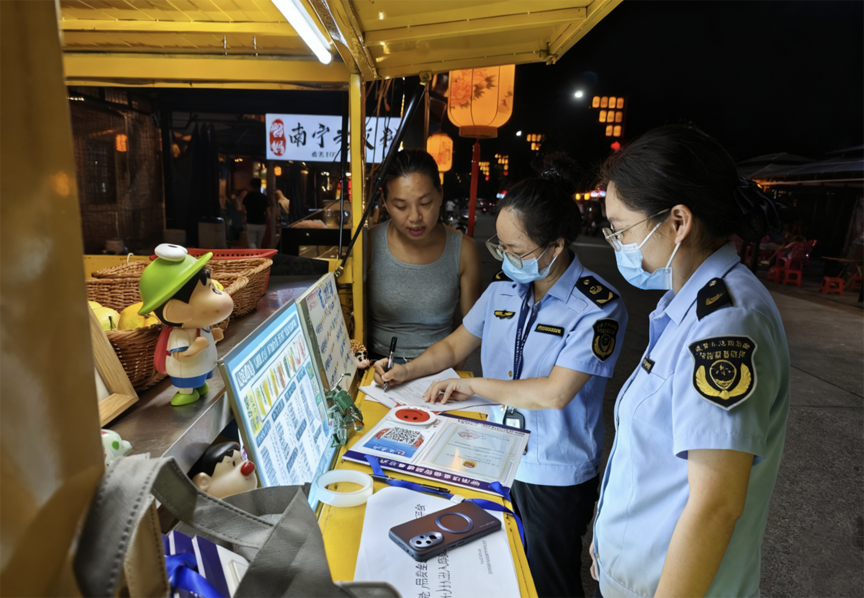 近日,鹿寨县市场监督管理局深入鹿化网红街夜市,组织开展食品摊贩监管服务协同治理专项行动。此次行动聚焦食品摊贩主体责任与推进规范化管理,旨在提升夜市食品安全的整体水平,激发夜间经济活力。