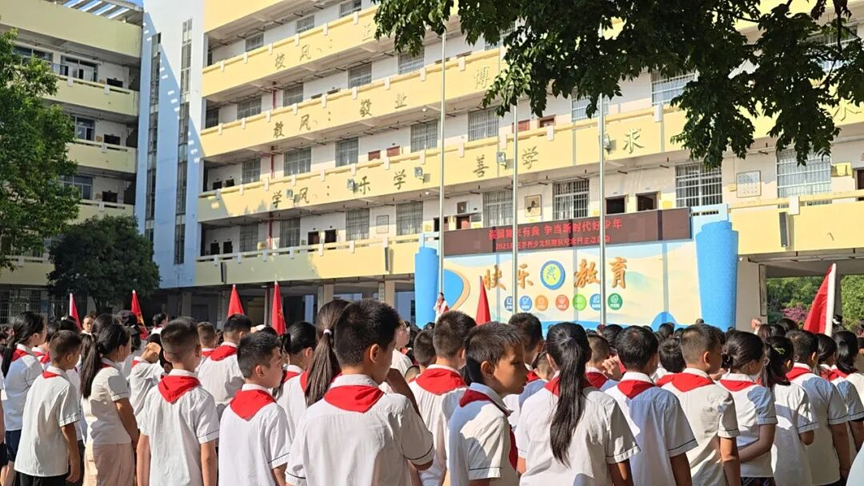 在大队辅导员的带领下,全体少先队员高举右拳庄严呼号,嘹亮誓言回荡校园,凝聚起“争当新时代好少年”的坚定信念。