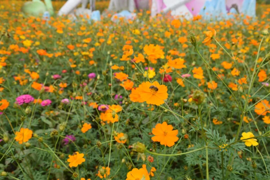 10月13日,记者来到“中渡弄里花谷”,只见连绵起伏的坡地上,明艳的橙黄、热烈的绯红、娇嫩的粉紫等各色花朵层层叠叠、随风摇曳,形成了一片壮观的菊科花卉海洋。步入花丛中,蜜蜂的嗡嗡声与游客的欢笑声交织,忙碌的采蜜身影与蝴蝶的优雅舞姿相映成趣,平添了无数野趣与生机。花田间,精心设置的观光步道、景观平台和打卡装置,为游客提供了绝佳的观赏和拍照角度。