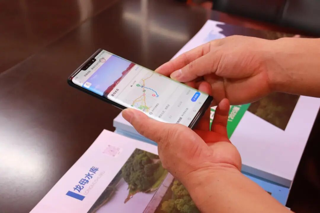 ▲工作人员扫描图鉴中的水库二维码,手机上出现水库的导航路线(图片由受访者提供)