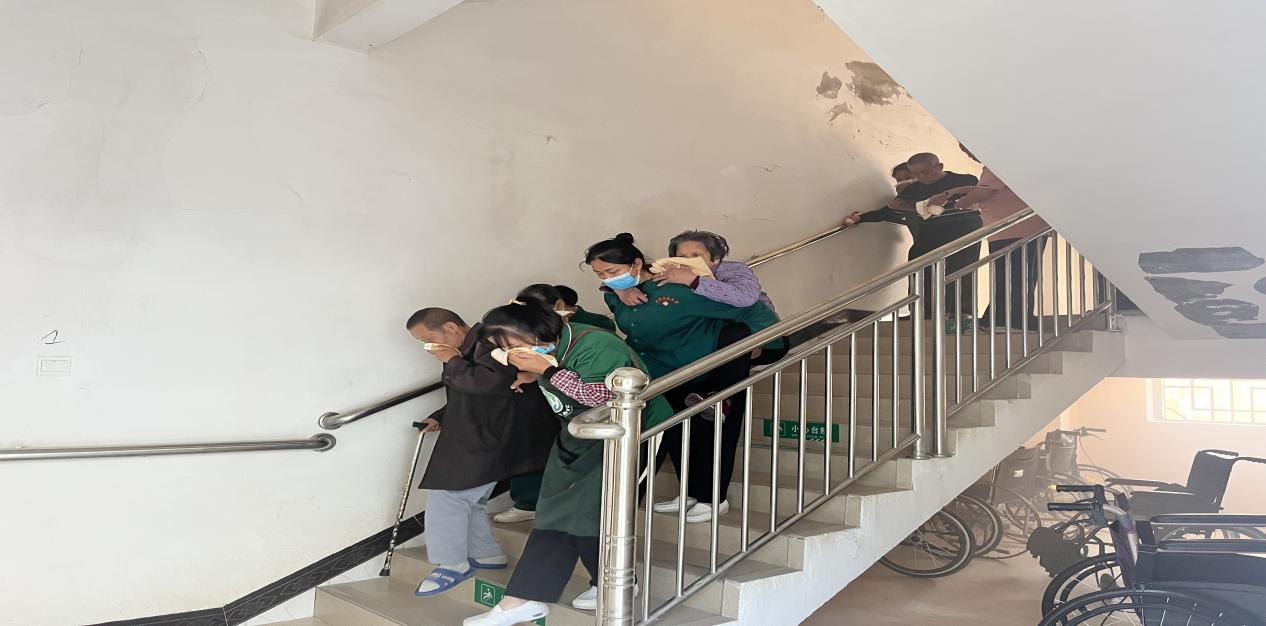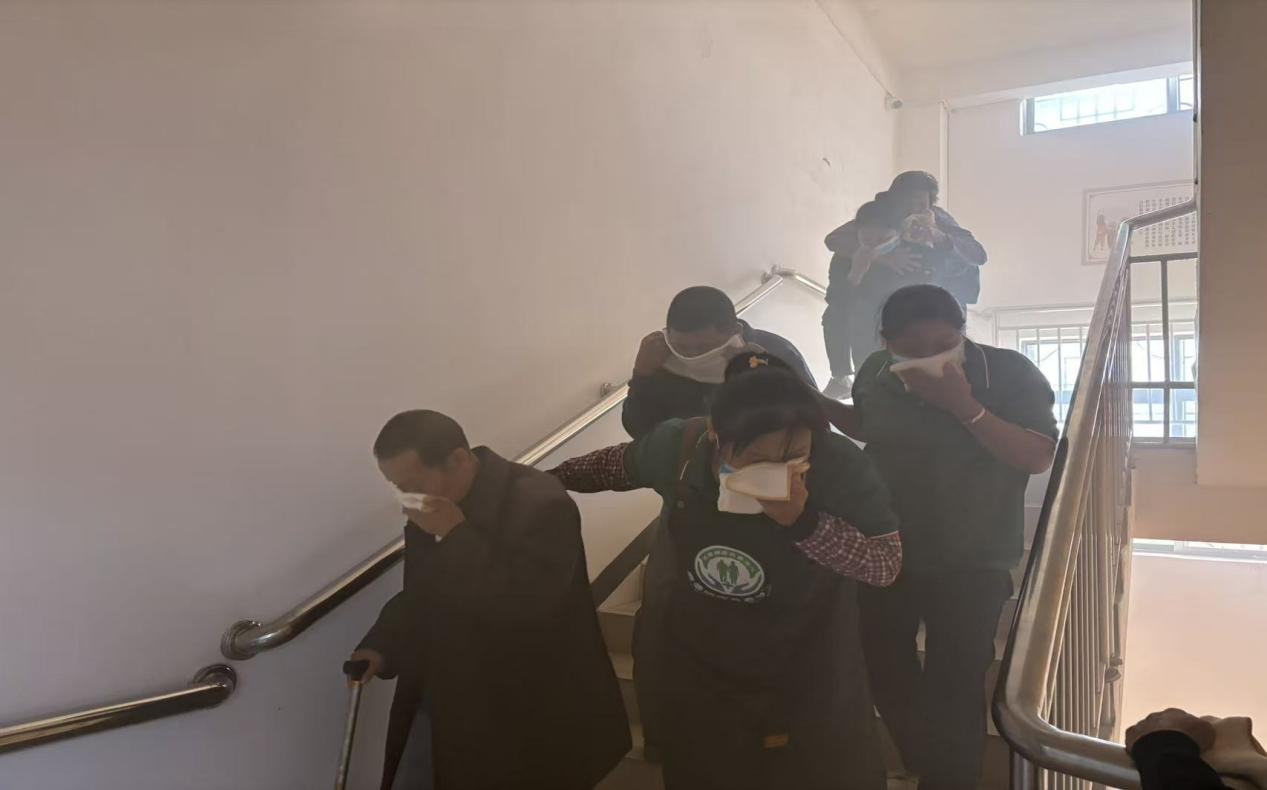 随着一阵急促的模拟火警铃声响起,演练正式开始。敬老院宿舍楼因电器短路引发“火情”,浓烟迅速蔓延。工作人员第一时间启动应急预案,在消防队员的指挥下,有序引导老人们用湿毛巾捂住口鼻,沿着安全通道弯腰快速转移至室外空旷场地;同时,消防队员迅速展开战斗队形,一组铺设水带冲向“着火点”扑灭火源,另一组对转移人员进行人数清点和情绪安抚。整个演练过程紧张有序,从火情响应、人员疏散到火灾扑救,各环节衔接流畅,仅用8分钟便完成了全部处置流程。