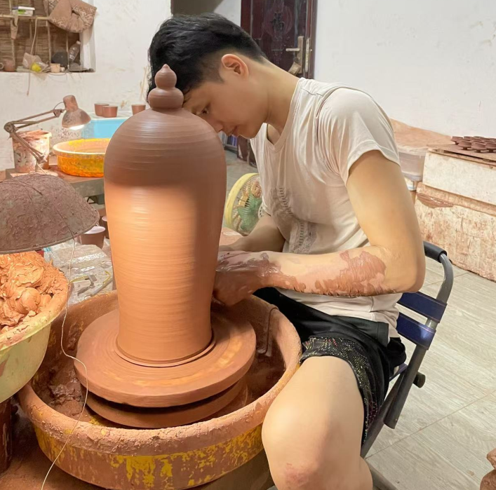 ▲韦冬艳的爱人韦营毅在制作陶艺品