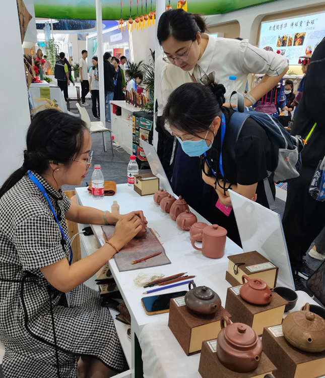 ▲韦冬艳在陶艺品上雕刻