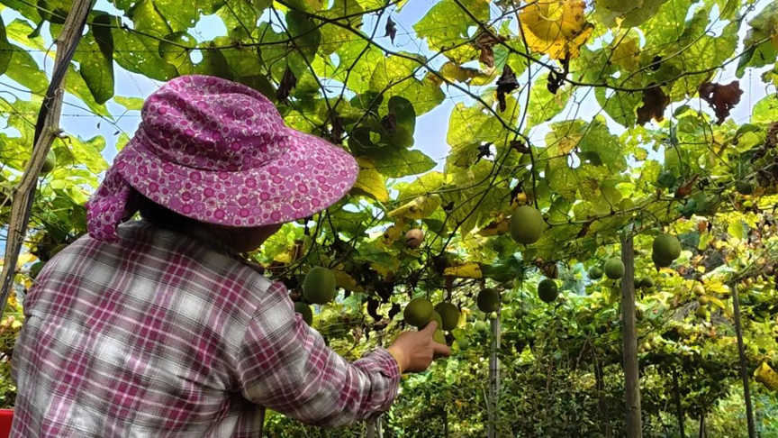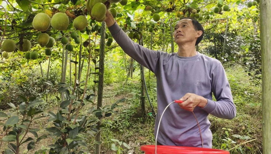 在上关江屯村民王刚的罗汉果种植地里,成片的棚架下,青绿浑圆的罗汉果挂满枝藤。王刚夫妇和几位前来帮忙的村民分工协作,动作娴熟地将成熟的果子一一摘下。不一会儿工夫,塑料桶里就装满了罗汉果,一桶桶罗汉果又被倒到竹筐里,再装到车上,望着满载的收获,王刚脸上难掩笑意。