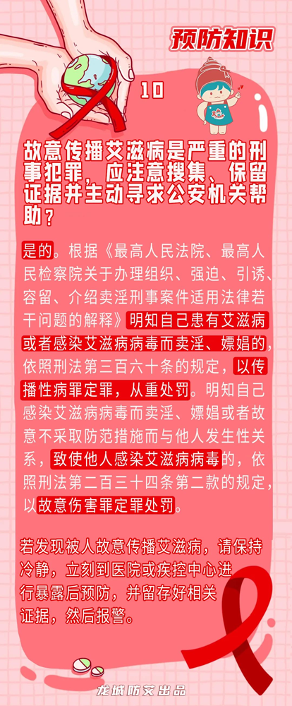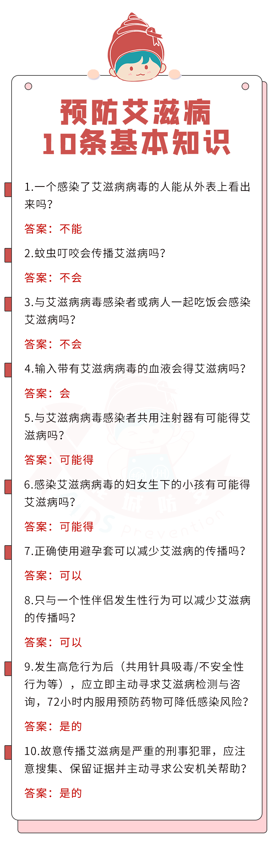 艾滋病是一种严重危害人类生命健康和社会经济发展的传染性疾病,要想战胜它,需要全社会的力量。以下10条预防艾滋病基本知识,我们每个人都要知晓!