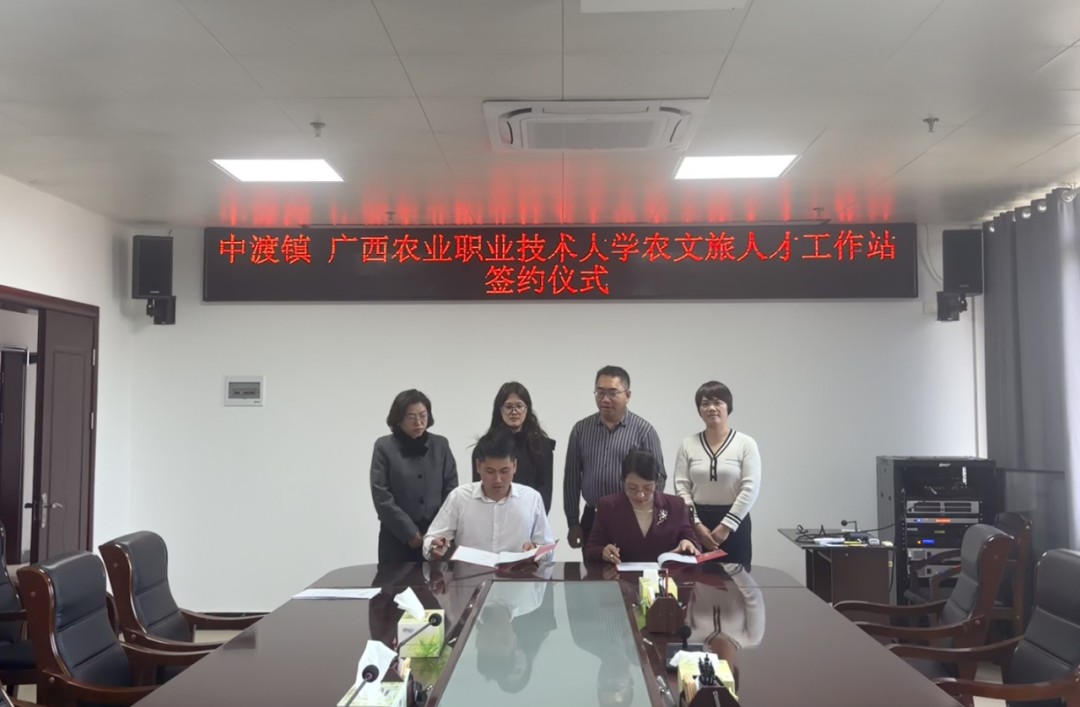 上午10时,中渡镇人民政府与广西农业职业技术大学经济管理学院共同为“农文旅发展合作工作站”揭牌。随后,双方签署政校合作协议,进一步明确在农业、文化、旅游、人才与科研五大板块的合作内容。