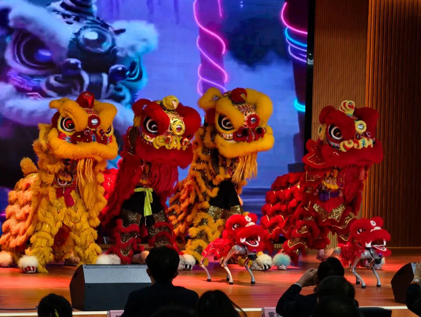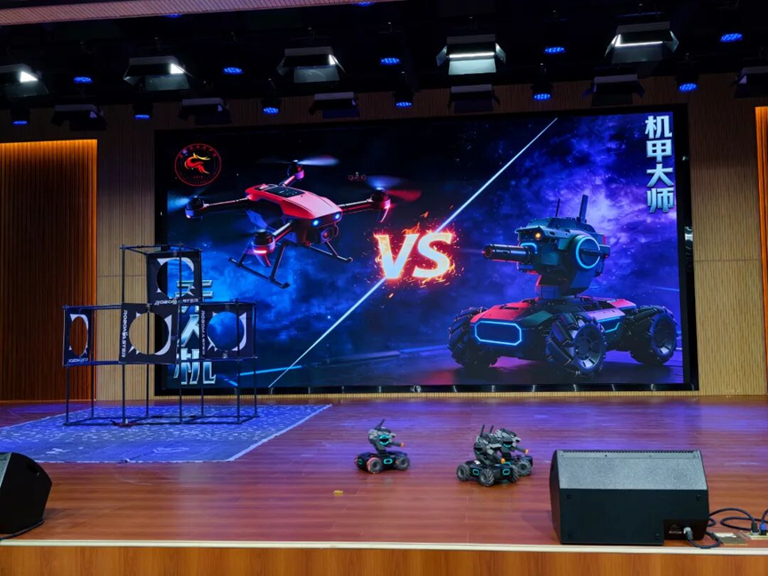 开幕式现场气氛热烈,创意表演点燃全场热情。“机器人+学生舞蹈”率先登场,机械精准与青春灵动完美融合,机器人随节拍灵活舞动、与学生舞者默契卡点,赢得阵阵掌声;龙狮表演别出心裁,传统舞狮的刚劲威武与机器狗的灵活灵动同场竞技,锣鼓声中雄狮腾跃、机器狗穿梭,传统民俗与现代科技碰撞出别样火花。科技成果展演环节备受瞩目,无人机机甲编队时而变换队形,时而低空盘旋,组合上演了一场精彩的“陆空科技秀”;师生们分享的科技成果,凝聚着智慧与汗水,彰显了科学探索精神与创新能力。