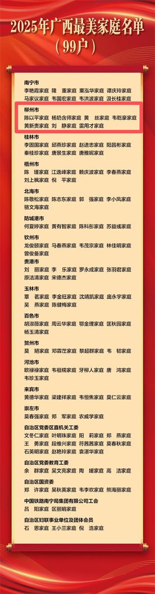 此次评选深入贯彻习近平总书记关于注重家庭家教家风建设的重要论述,以弘扬爱国爱家、相亲相爱、向上向善、共建共享的社会主义家庭文明新风尚为目标,为建设新时代壮美广西注入坚实家庭力量。李艳霞、隆重、粟泓华等99户入选家庭涵盖多类典型:既有扎根边疆的坚守者,也有投身乡村振兴、科技兴农的实践者;既有践行民族团结、邻里和睦的示范者,也有立足岗位建功、热心公益的奉献者。这些家庭将个人理想、家庭幸福与国家发展、民族团结紧密结合,以优良家风传承中华美德,生动诠释新时代家庭责任担当,成为广西文明新风的鲜活标杆。
