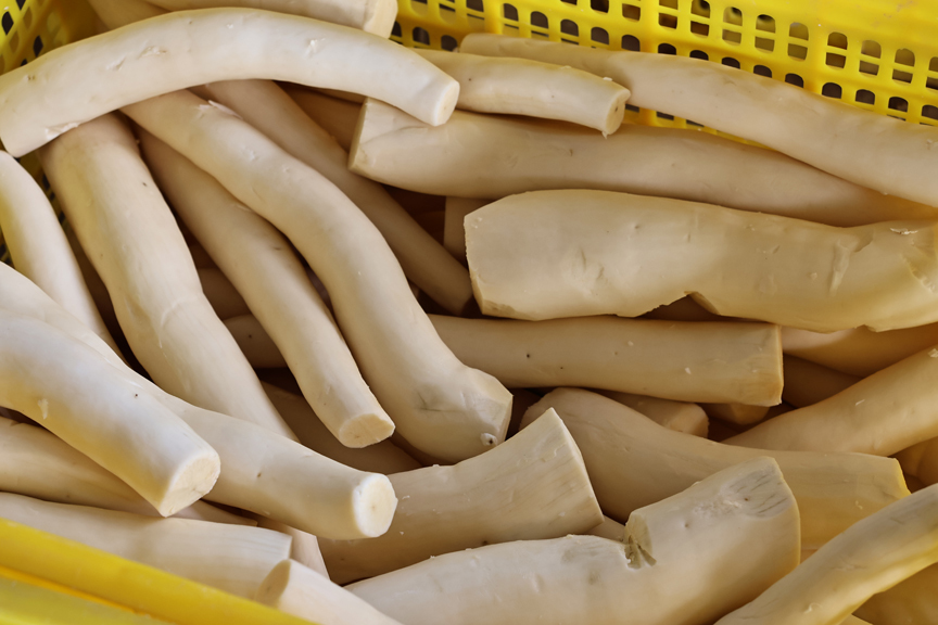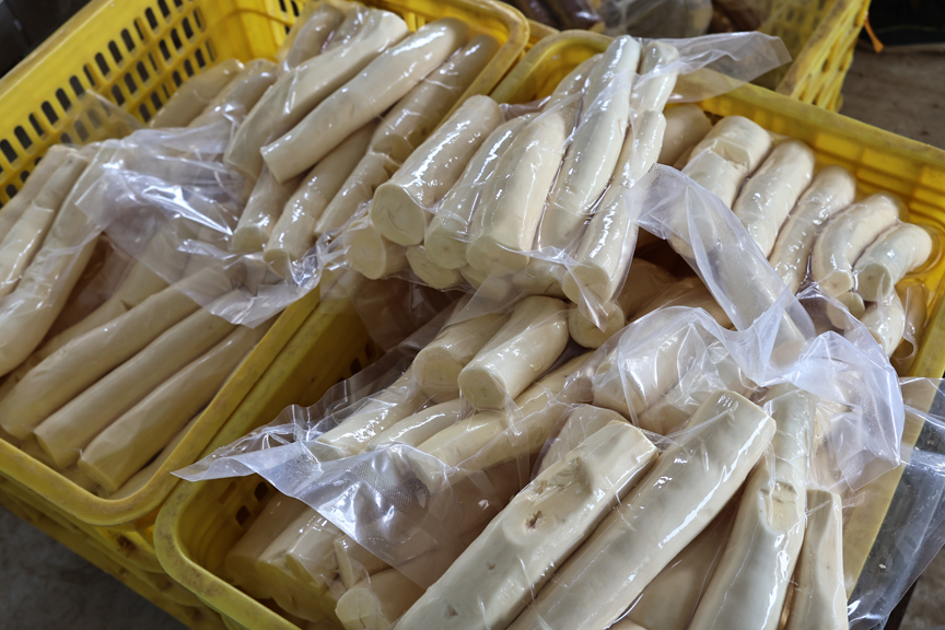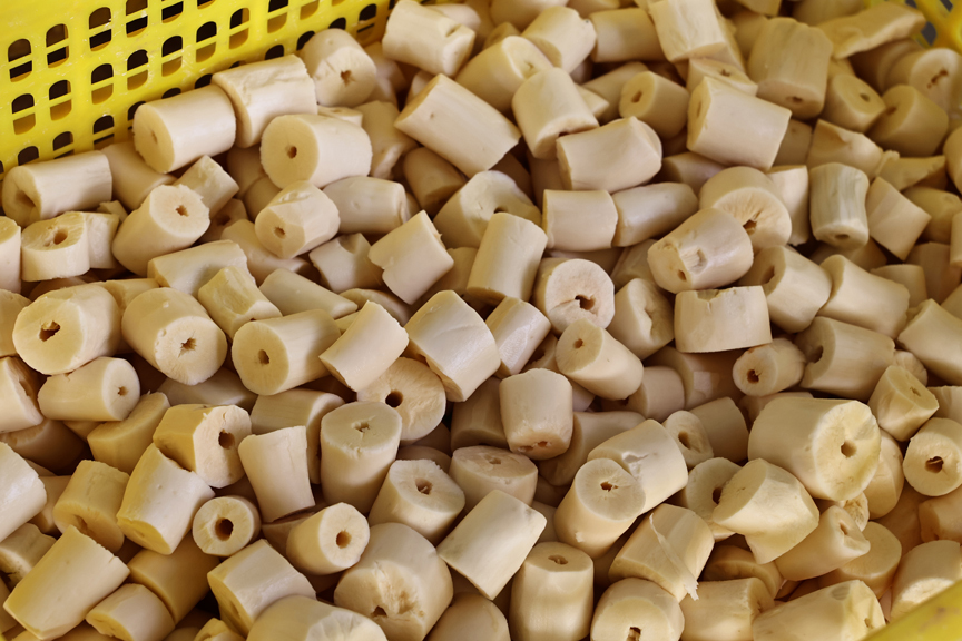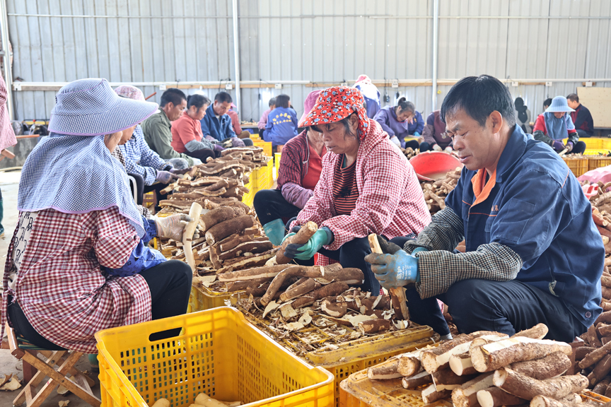 近日,平山镇黄心面包木薯种植地里,村民们正在挥刀除叶、撬土挖薯,一个个硕大饱满的木薯接连破土而出;位处石豆屯的木薯加工厂内,削皮、分拣、真空打包等工序正有条不紊地进行,加工好的木薯产品通过线上线下销售渠道发往全国各地。