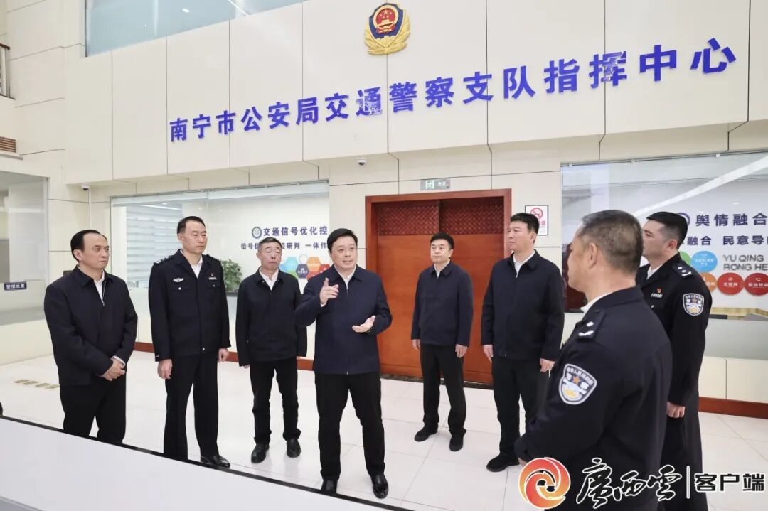 韦韬还来到南宁市公安局交通管理支队指挥中心,通过视频查看重点区域实时道路交通情况,了解假期交通安全保障等工作,要求南宁市持续开展道路交通安全专项整治行动,加大路面执法管控和源头治理力度,统筹做好春运工作,优化交通疏导方案,全力保障群众出行安全顺畅。自治区各有关部门和各设区市要聚焦城市运行安全存在的薄弱环节精准发力,着力防范集聚性活动以及低温雨雾等天气带来的各类风险,坚决防范遏制重特大事故发生,为实现“十五五”良好开局守牢安全底线。