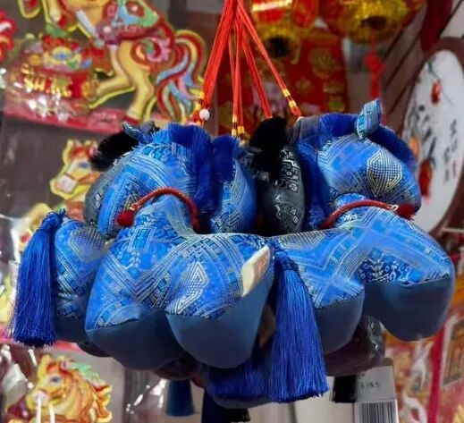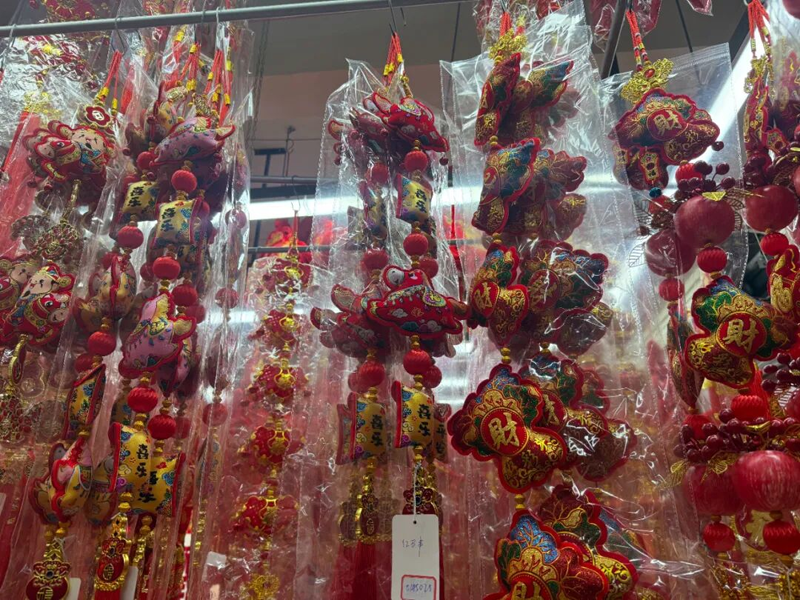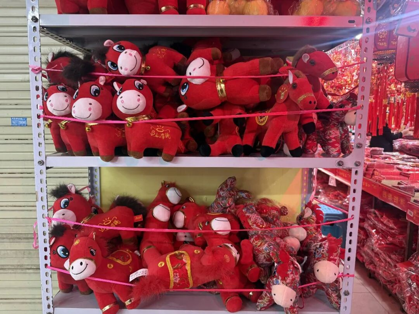 1月12日上午,记者走进新时代商业港喜庆用品区,首先映入眼帘的是一片火红喜庆的景象,瞬间让人感受到浓浓的年味。高高挂起的灯笼、红彤彤的福字、寓意吉祥的对联,以及各式以“马”为造型的玩偶、挂件等,将整个喜庆用品区装点得年意盎然。这些马年装饰品大多产自义乌和广州,售价也挺亲民,大多在几元到几十元不等。记者注意到,当前的采购主力集中在两大群体:为节前备货的零售店主,以及为单位做氛围布置的职工。