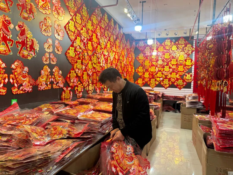 “今年是马年,特意多选了带马元素的装饰,贴在办公室里,看着就喜庆!”一位正在选购的单位职工笑着说,从玻璃门贴纸到桌面小摆件,再到对联、气球,每一样都透着对新年的期待。