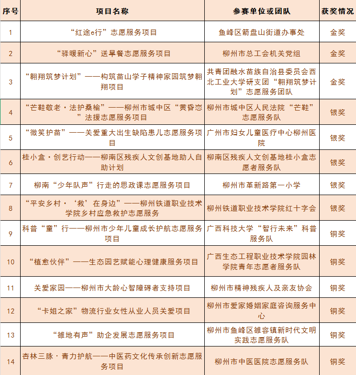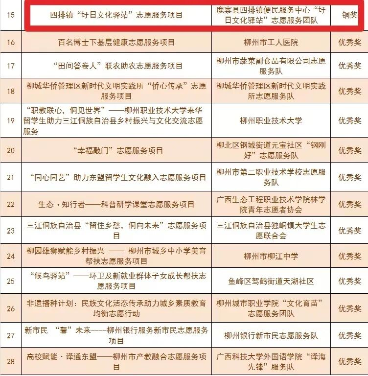 本次大赛自启动以来,共收到申报项目84个。经过评审组的认真评审与筛选,最终28个项目进入决赛。决赛现场,各参赛团队围绕项目管理、运营保障、实施成效及创新亮点等方面进行了全面展示,项目类型涵盖养老服务、乡村振兴、服务新经济新业态新就业群体、国际志愿服务等内容,充分体现了柳州市志愿服务工作的专业性和创造力。经过激烈角逐,我县四排镇“圩日文化驿站”志愿服务项目荣获铜奖。