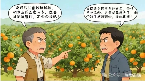 更棘手的是,同期砂糖橘市价每斤下跌0.5元,李某觉得“亏上加亏”。陈某却坚持合同为“包园”性质,价格已综合多种因素商定,并非单纯按亩计价,拒绝退款。