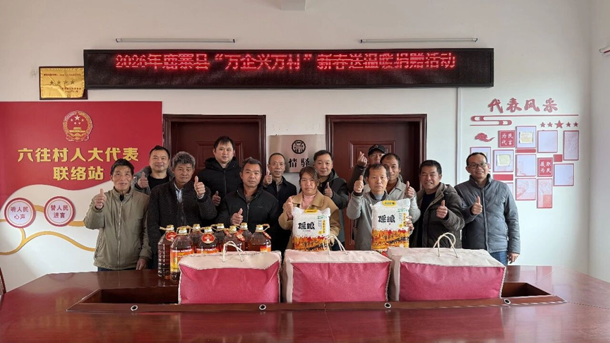 1月28日,鹿寨县工商联携手广西柳州古宏木业有限公司,到寨沙镇六往村开展“万企兴万村”爱心捐赠活动,为当地10户困难群众送上慰问物资与新春祝福,让困难群众在冬日里感受到浓浓暖意。