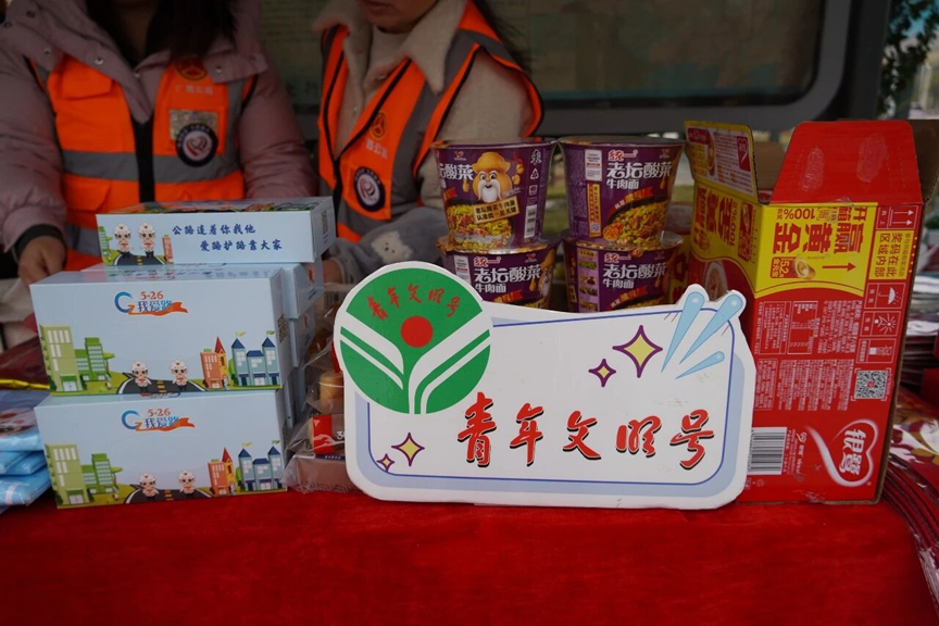在“暖心驿站”服务点,现场发放的免费物资种类丰富,不仅有方便面、面包、牛奶等应急食品,也有各种各样的新年礼包。此外,旅客还可选购“广西公文包”、螺蛳粉等广西特色产品,把广西年味带回家。