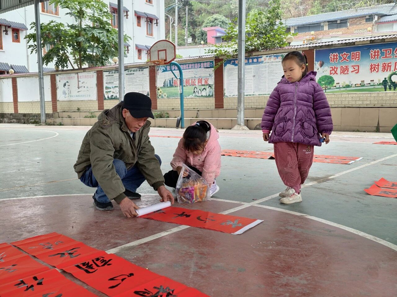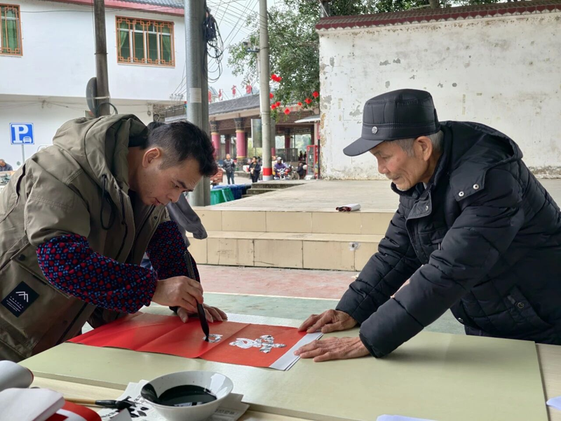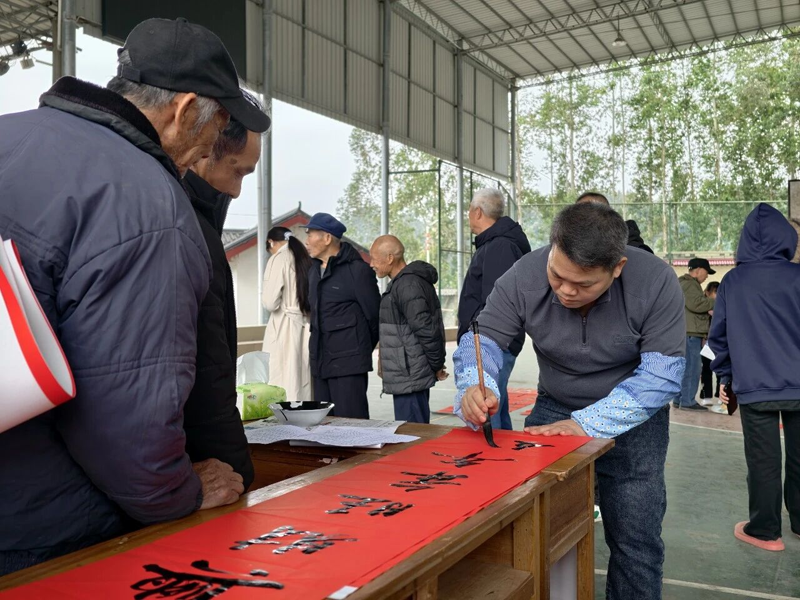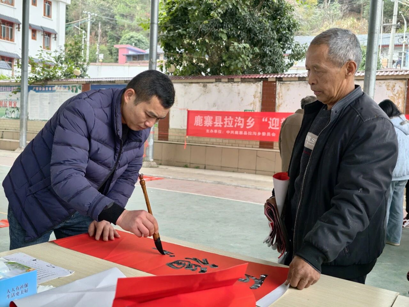 当天,该协会还在拉沟乡篮球场开展新春送春联活动。活动现场人头攒动,书法爱好者们挥毫泼墨、笔走龙蛇,一副副寓意吉祥的春联、一个个饱含祝福的“福”字跃然纸上,喜庆的红纸上,笔墨流转间皆是对新春的期盼、对生活的美好祝愿。群众有序排队等候,挑选心仪的联语,志愿者协助展纸、晾墨、分装。拿到墨迹未干的春联,村民们喜笑颜开,对这份“手写文化年货”赞不绝口。