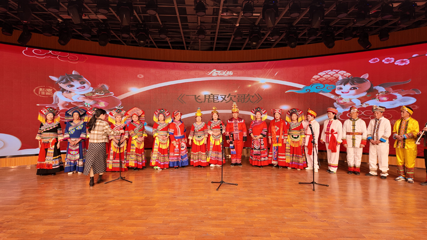 2月7日晚,中渡镇春节联欢晚会现场,鹿寨县老年大学和中渡镇老年大学山歌班的学员们表演了多个富有地方特色的节目,《飞鹿欢歌》为传统山歌赋予新调,《四大名菜+敬酒歌》、《迎客歌+赞美歌》的演绎中,原生态腔调悠扬婉转;彩绸班带来的《刘三姐回乡唱新歌》,将人物与乡村振兴故事巧妙融合;《王三打鸟选段》《十二月花》等表演,一招一式韵味十足。香桥彩调队、英山社区彩调队也相继登台, 让戏迷们大饱耳福,台下掌声、喝彩声不断。