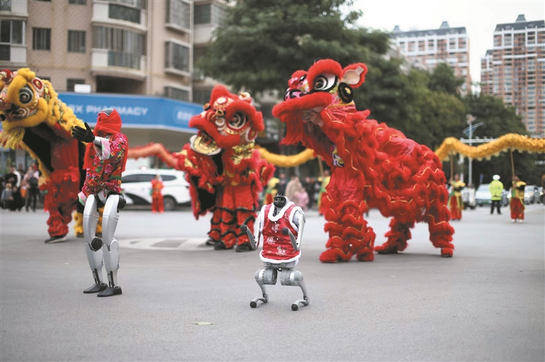 当巡游队伍抵达行政中心广场的机甲表演互动区时,现场气氛再次被点燃。高达数米的“财神爷”“大黄蜂”“齐天大圣”等机甲战士威武伫立,机械关节灵活转动,引得众人仰头惊叹。地面上,憨态可掬的机器狗和人工智能机器人,时而翻滚跳跃,时而作揖拜年,即兴献上新春祝福、表演舞蹈,让市民游客流连忘返,纷纷上前合影留念。