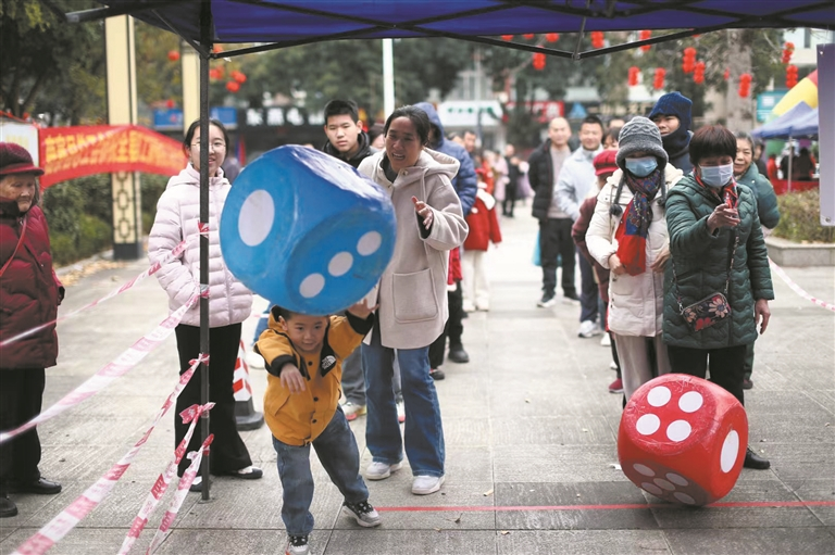 新春游园喜乐会集趣味性、挑战性、健身性于一体——“最佳投手”模拟飞镖技巧,游戏者尽力将手中的小塑料球投向靶子;“幸运套圈”比的是手上功夫,看谁的塑料圈投得准,套住琳琅满目的奖品;“弹珠迷宫”和“小猫钓鱼”考验手眼协调能力和耐心;“开心轮盘”与“六六大顺”玩的是手感、运气和技巧。