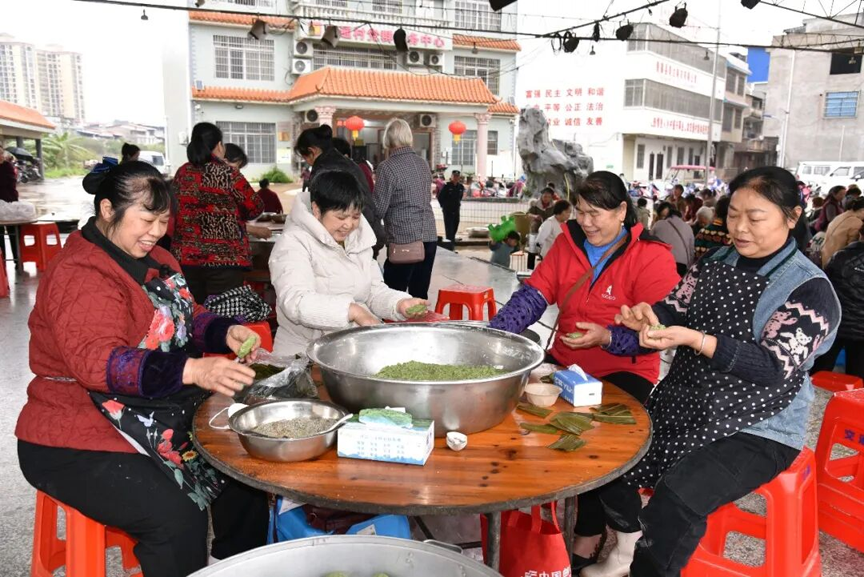 上午9时许,交通村操场已是人头攒动,笑语盈盈。活动现场,村委工作人员为大家准备好圆桌、凳子,以及制作艾粑粑的食材和工具,为活动顺利开展做好充足准备。妇女们分工协作,有的揉制糯米粉,有的调配花生芝麻馅料,现场一派热火朝天的景象。