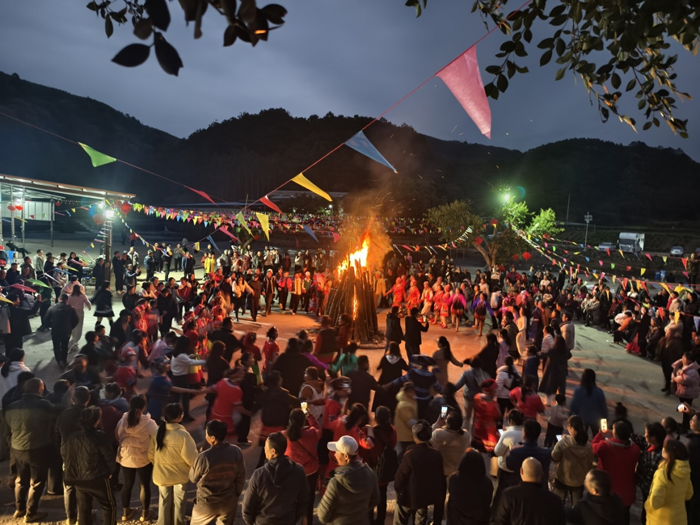 夜幕降临,堰坝广场篝火燃起,成为活动最动人的篇章。村民、游客围炉而聚,伴随着欢快的壮乡旋律集体起舞,手拉手、心连心,褪去疲惫、传递欢喜,在欢声笑语中感受民族团结的温暖,让三月三的夜空充满团圆与欢乐的气息。